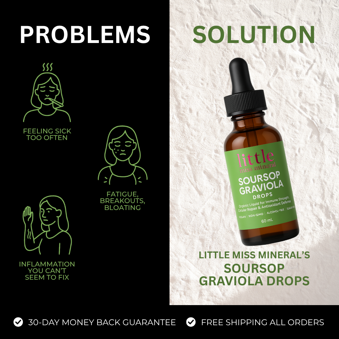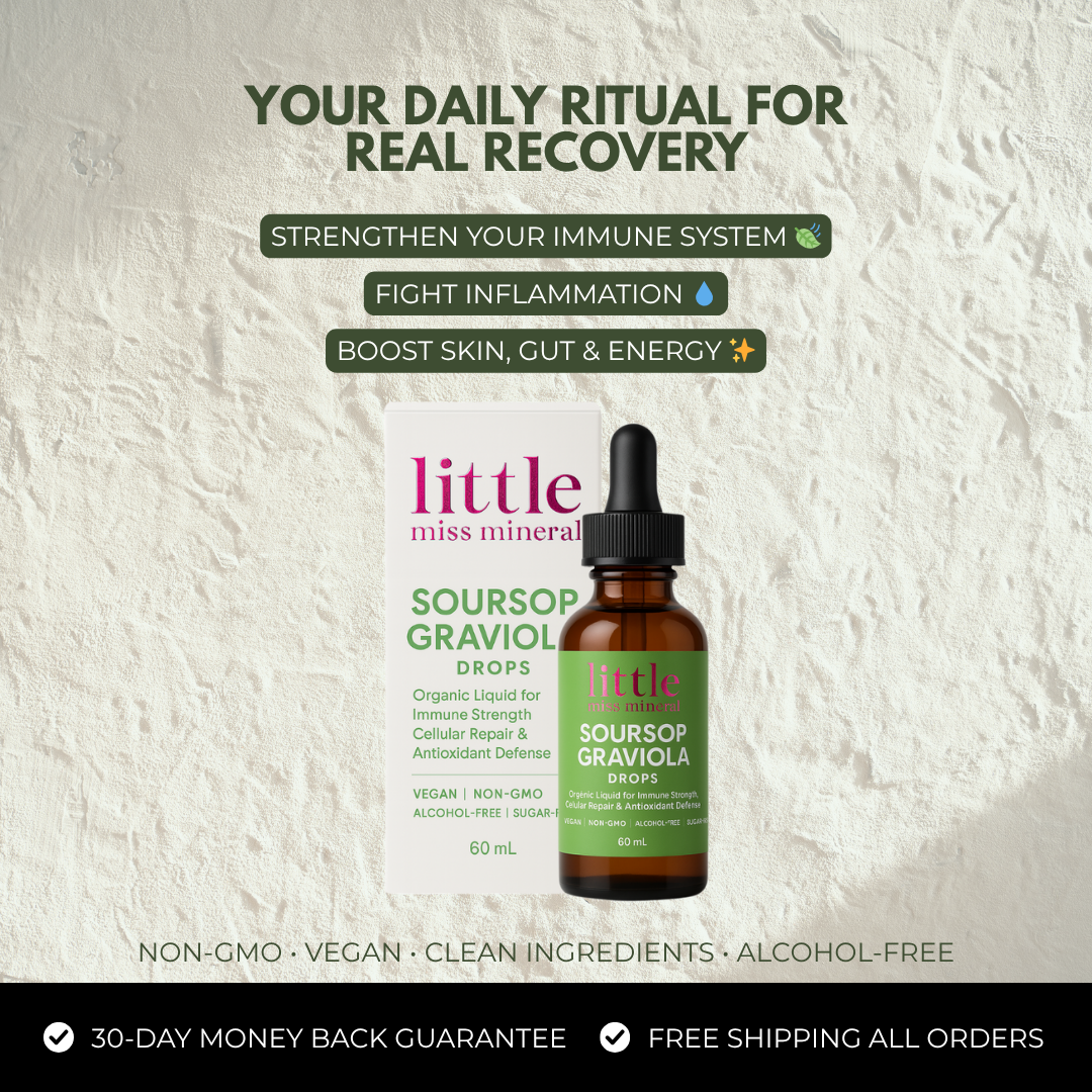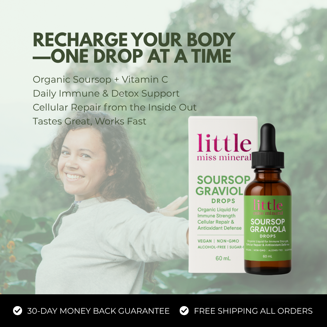 Soursop contains powerful plant compounds like acetogenins, antioxidants, and flavonoids that help your body repair on a cellular level. It’s known to support immune strength, improve energy, protect cells from oxidative stress, and reduce inflammation that leads to chronic fatigue, breakouts, and digestive issues.